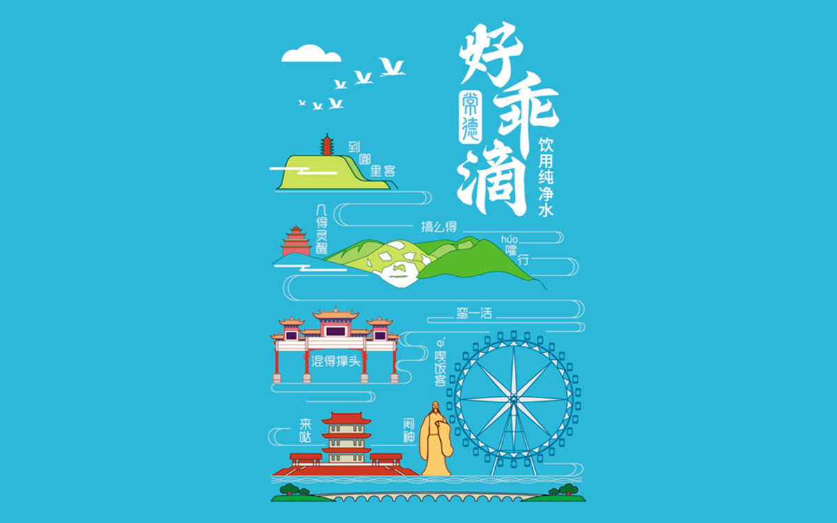 在常德旅游產(chǎn)業(yè)大發(fā)展的環(huán)境下,亟需具有文化性、傳播性、低成本的文創(chuàng)產(chǎn)品作為旅游宣傳載體,而小瓶裝純凈水,可以很好的起到常德旅游形象宣傳的目的,在水包裝上挖掘地域文化,用小瓶裝水傳播常德旅游,且成本非常低廉。 如何在小瓶裝水的包裝上體現(xiàn)常德旅游特色和常德地域文化,這是一個(gè)非常大的挑戰(zhàn)。且瓶裝水包裝幅面有限,在極小的幅面內(nèi)選擇怎樣的元素體現(xiàn)常德旅游和地方文化,如何挖掘、篩選這些元素,需要深入考察和研究地方文化。 中世銳意設(shè)計(jì)將常德旅游景點(diǎn)的代表元素做了篩選,并用當(dāng)下流行、時(shí)尚的插畫手法繪制出象征圖形,形成了非常直觀的旅游資產(chǎn)的展現(xiàn)。 并注意到常德方言是一個(gè)非常有趣的地方語(yǔ)言文化,原滋原味的常德方言隨著社會(huì)經(jīng)濟(jì)的發(fā)展逐漸被輕視和消亡,而作為極具地方特色的常德方言,是地方文化的無(wú)形資產(chǎn)。于是,中世銳意設(shè)計(jì)深挖原滋原味常德方言,讓一句句鮮活的方言短語(yǔ)與美麗景色插畫相結(jié)合,形成旅游資產(chǎn)+地域文化的綜合展現(xiàn)。 當(dāng)這款“好乖滴常德” 瓶裝水出現(xiàn)在常德大街小巷時(shí),對(duì)于本地人來(lái)說(shuō),熟悉的常德景色與家鄉(xiāng)話是那么親切,自豪感油然而生;對(duì)于外地游客,瓶裝水上的美麗景色或許會(huì)成為他們下一站旅行的目的地,而水瓶上有趣、陌生的地方方言,會(huì)成為他們來(lái)到常德之后輕松掌握常德話的啟蒙工具,輕松學(xué)上兩句常德話,將成為愉快的交流場(chǎng)景。