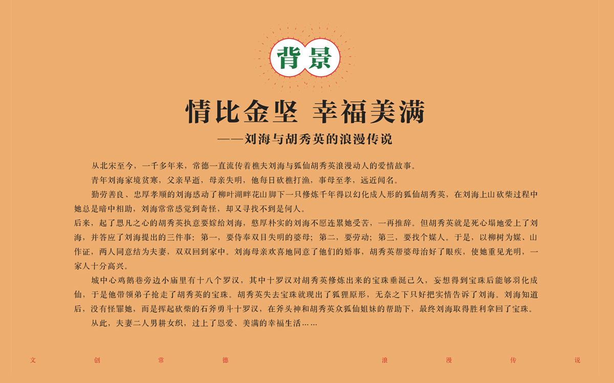 這是中世銳意前后長達(dá)一年左右的文創(chuàng)策劃設(shè)計項目, 也是本年度最重要,意義最深遠(yuǎn)的一項工作, 從2018年冬天接到關(guān)于柳葉湖城市旅游相關(guān)的文創(chuàng)設(shè)計任務(wù), 到最近完成《劉海砍樵》系列文創(chuàng)策劃設(shè)計, 中世銳意從調(diào)研—想法—構(gòu)思—概念—草圖—到完成全部策劃設(shè)計方案, 其中付出的心血不可描述,更離不開甲方的高度配合和支持。 所以,一個優(yōu)秀的設(shè)計項目, 往往更多的因素是內(nèi)心非功利化的信念和一個無比優(yōu)秀的甲方! 我們將設(shè)計原則確定為傳承性、趣味化、呆萌系、喜悅感四個原則,試圖沖破“劉海砍樵”傳統(tǒng)的表達(dá)形式,在文化尋根的基礎(chǔ)上,喚起年輕一代對于久遠(yuǎn)民俗資產(chǎn)的認(rèn)知。