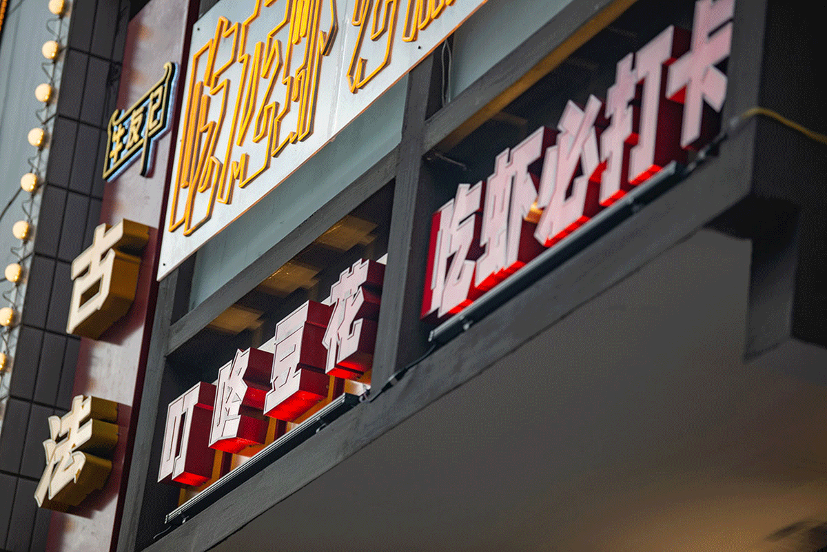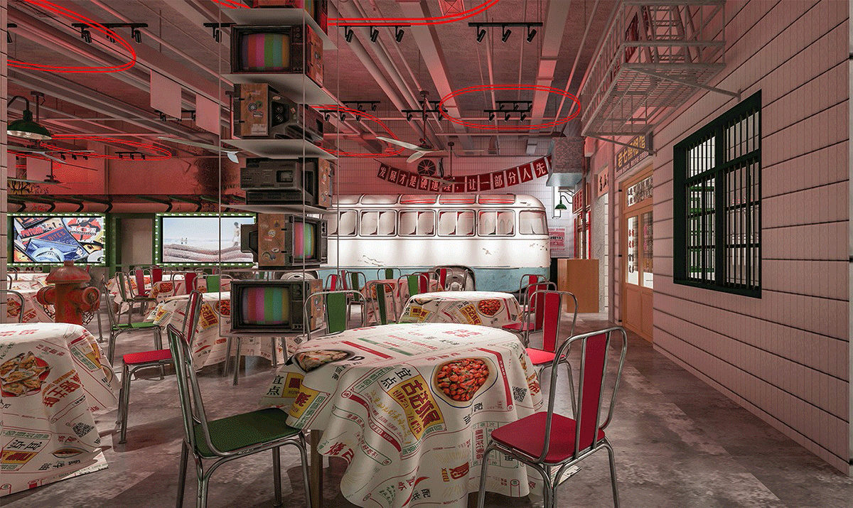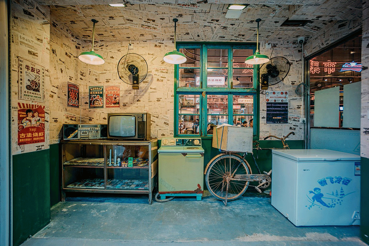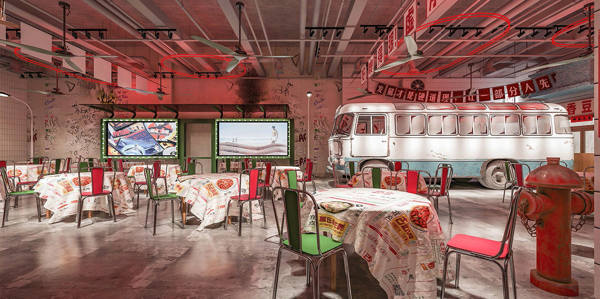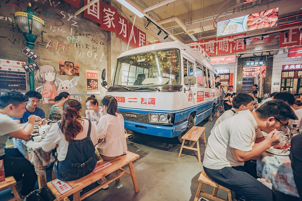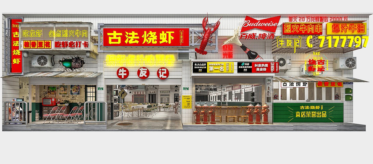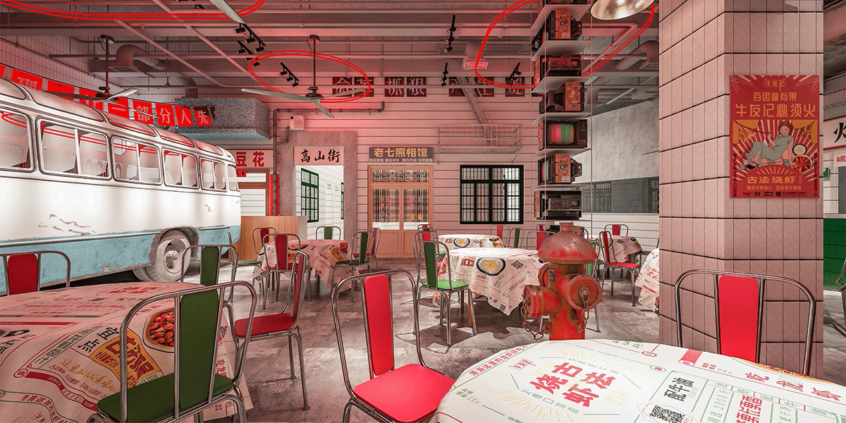 品類設(shè)置明檔,外賣檔口設(shè)置,洗蝦、串肉公開(kāi)展示、市井招牌組合、趣味樸素的文案創(chuàng)作、跑堂員吆喝聲、老舊公交車的既視感。這種場(chǎng)景塑造,不是簡(jiǎn)單的復(fù)制過(guò)去,不是停留在形式表面,而是通過(guò)視覺(jué)、聽(tīng)覺(jué)、觸覺(jué)全方位營(yíng)造逝去年代的煙火氣。