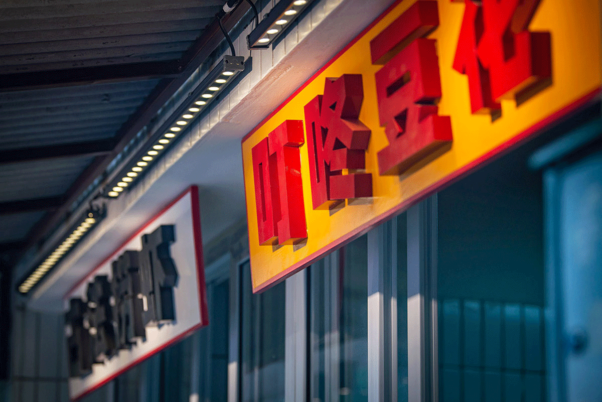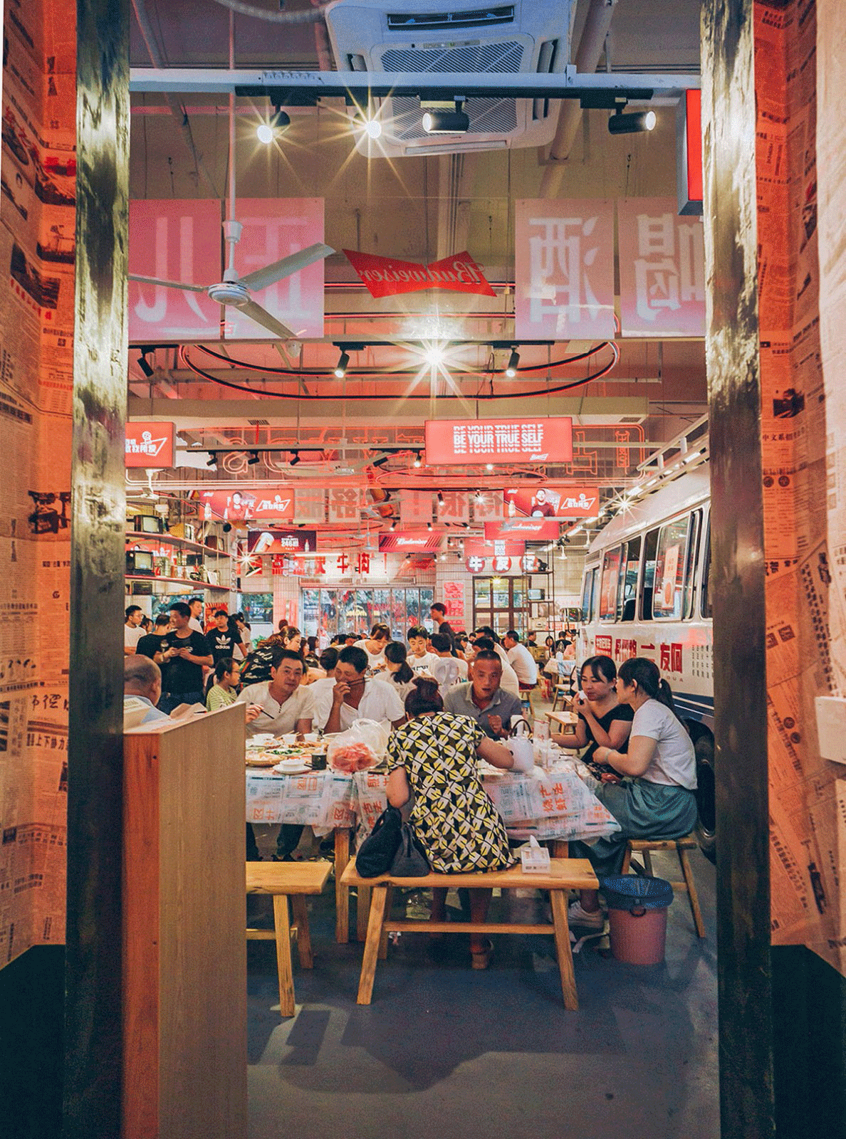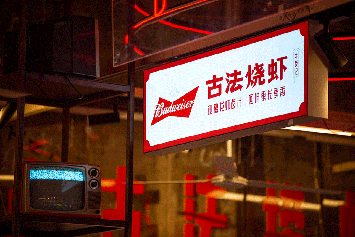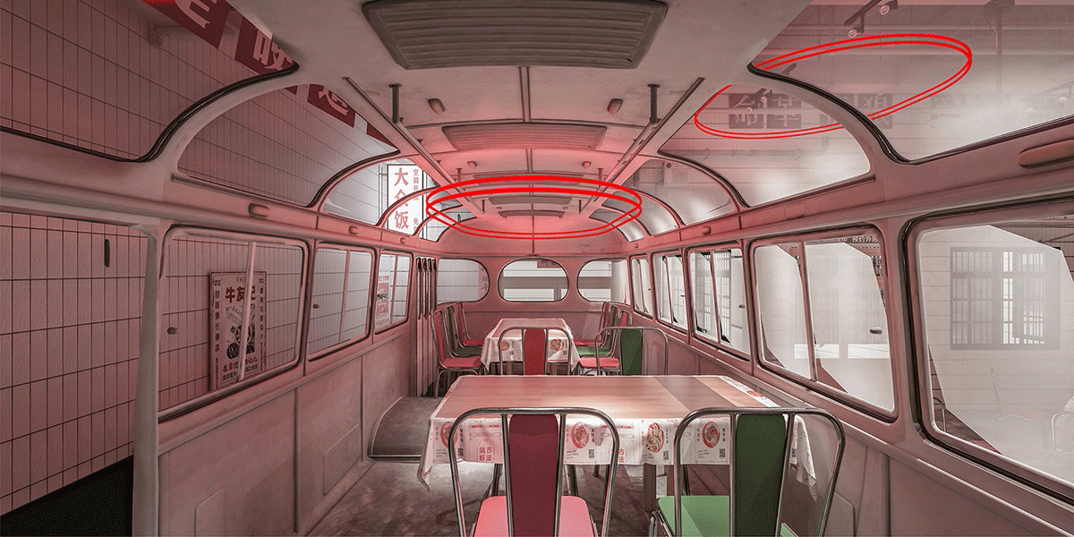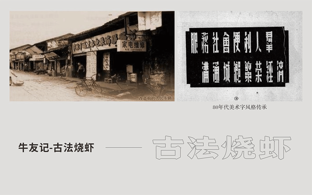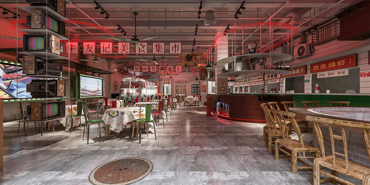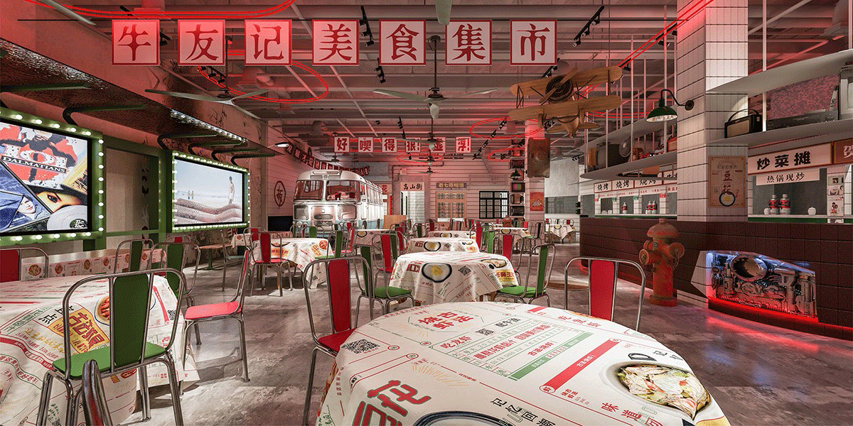 品類設(shè)置明檔,外賣檔口設(shè)置,洗蝦、串肉公開(kāi)展示、市井招牌組合、趣味樸素的文案創(chuàng)作、跑堂員吆喝聲、老舊公交車的既視感。這種場(chǎng)景塑造,不是簡(jiǎn)單的復(fù)制過(guò)去,不是停留在形式表面,而是通過(guò)視覺(jué)、聽(tīng)覺(jué)、觸覺(jué)全方位營(yíng)造逝去年代的煙火氣。