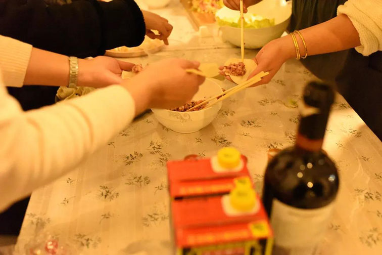 有的是餃子、零食、紅酒、白酒、啤酒和笑聲,